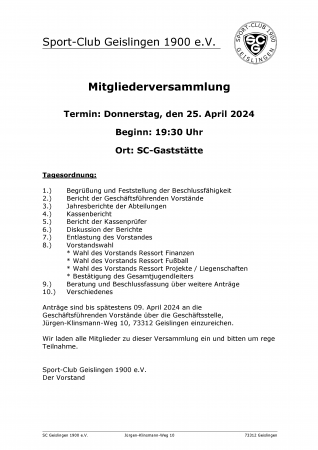 Liebe Mitglieder des SC Geislingen,wir möchten euch herzlich zur diesjährigen Mitgliederversammlung einladen.Die Versammlung findet am Donnerstag, den 6. April…