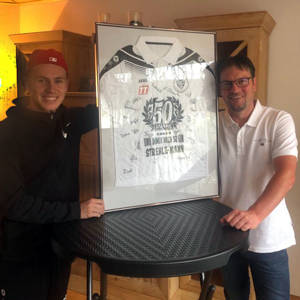Am gestrigen Sonntag wurde Andreas Strehle 50 Jahre jung. Die erste Mannschaft des SC Geislingen 1900 wartete mit einem Geschenk für ihn auf: Der Kapitän des Landesligisten, Pascal Volk, überreichte dem ‚Evergreen Andi‘ ein gerahmtes Trikot mit den Unterschriften der Kadermitglieder.